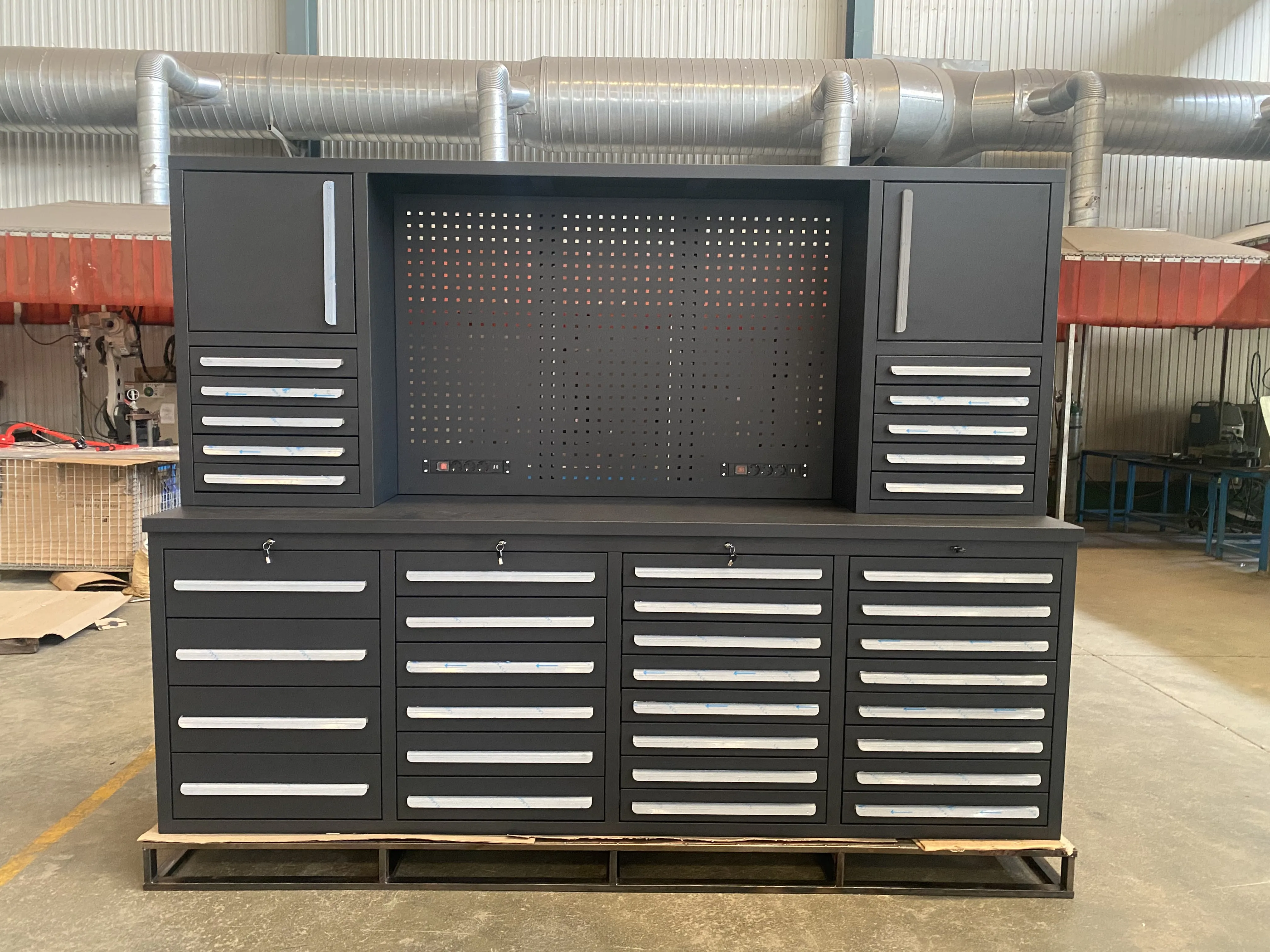 Kabinet alat yaiku 2550 milimeter dawa. Kekandelan, warna, ukuran lan laci bisa disesuaikan miturut syarat pelanggan. Loro WROKBENCH lan laci digawe saka baja sing adhem. Ana rong jalur listrik ing kene. Laci dilengkapi lampu LED, lampu LED bisa digantung ing panel bolong sing nggampangake lampu nalika nggarap workbench. Ana bantal ing laci, sing bisa nyuda goresan kanthi efektif.